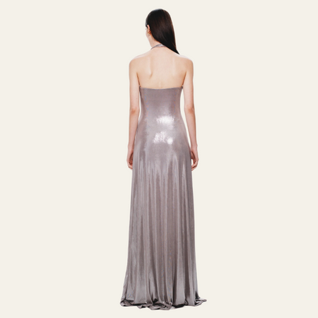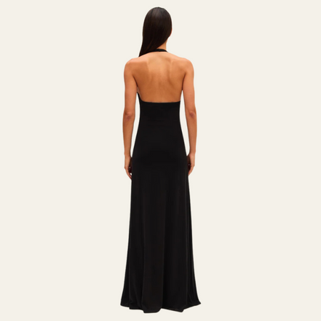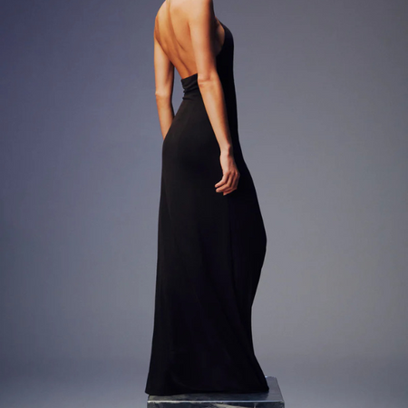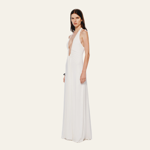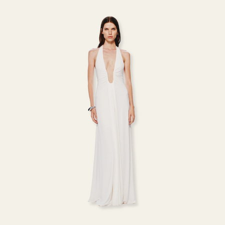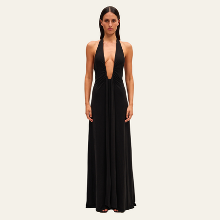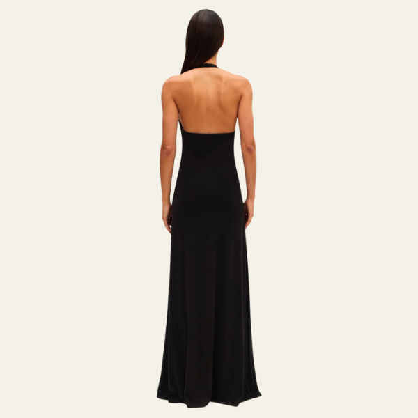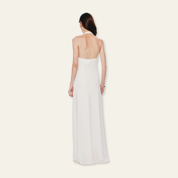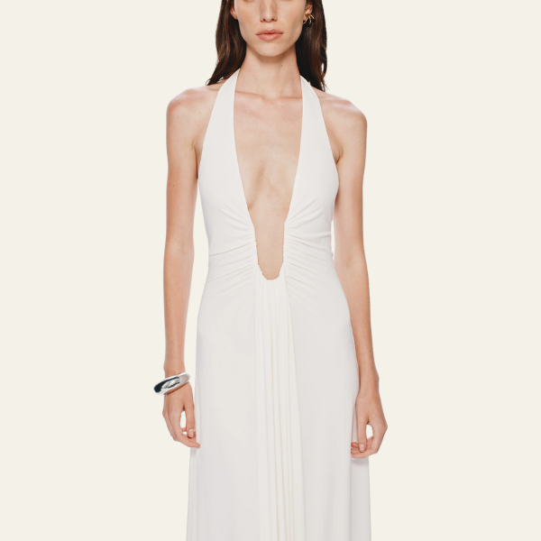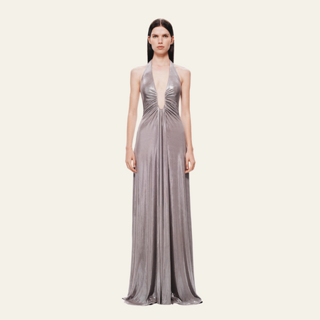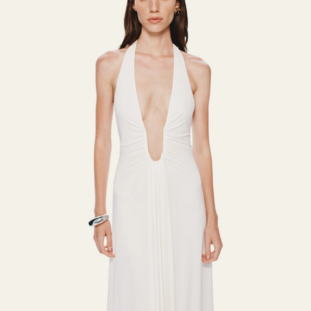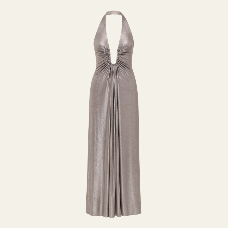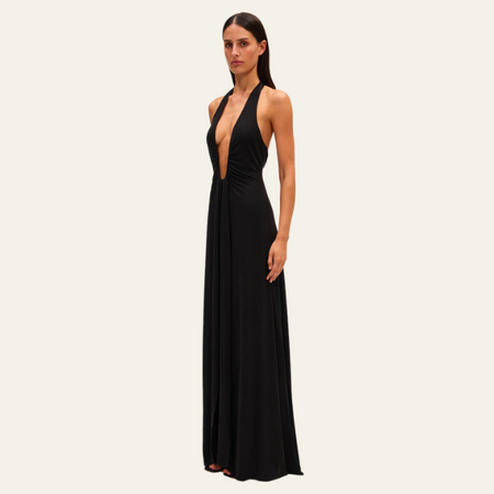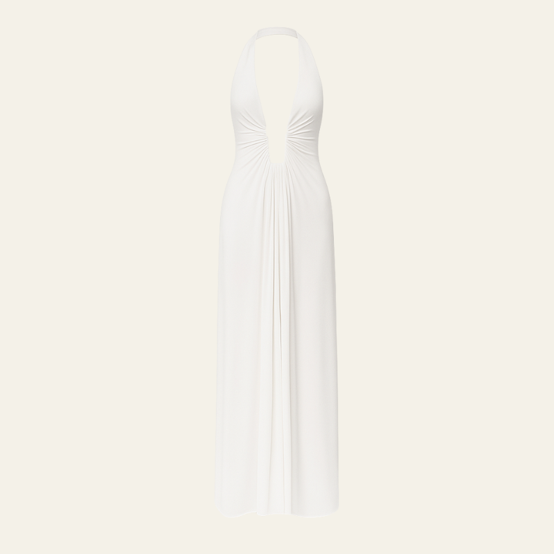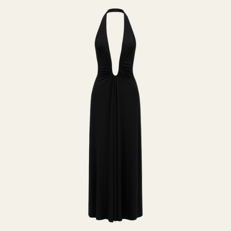 This women’s halterneck maxi dress radiates effortless coastal glamour with its plunging neckline and fluid draped silhouette. Soft gathers at the waist create a graceful, elongated line while offering a light, flowing movement. Perfect for seaside soirées or summer evenings styled with delicate gold jewelry.