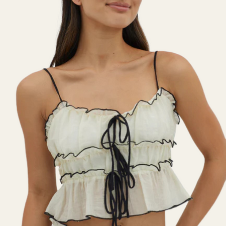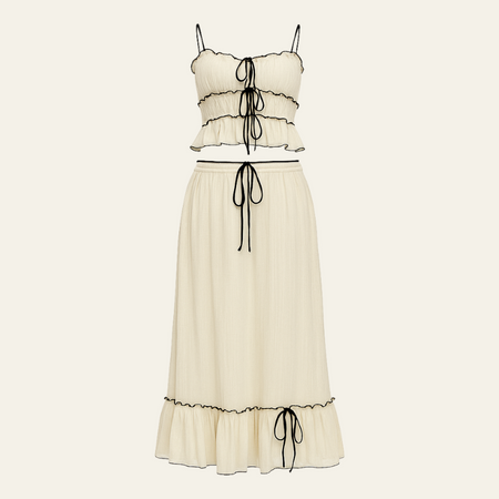 This women’s resort co-ord captures breezy coastal elegance with its ruffled crop top and flowing maxi skirt.