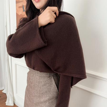 This women’s knit top sweater blends sculptural minimalism with quiet luxury through its integrated scarf-neck detail.