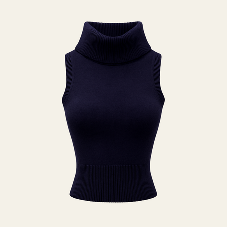 This women’s knit vest embodies refined minimalism with its sculpted turtleneck and clean sleeveless silhouette. The compact knit offers a smooth, structured drape while layering effortlessly across seasons. Perfect over crisp shirting or under blazers for an elevated transitional look.