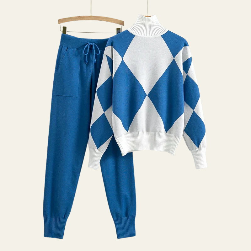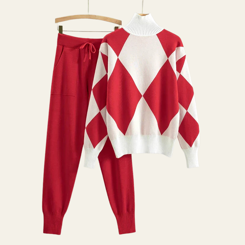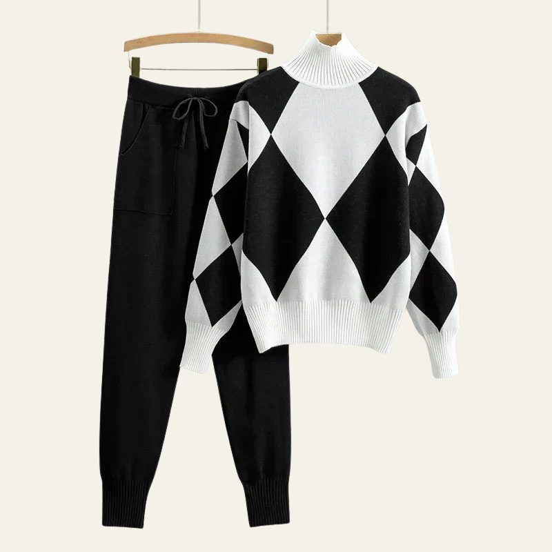 It includes high-waisted drawstring knit pants and a cozy turtleneck sweater featuring a bold oversized argyle pattern in warm neutral tones.