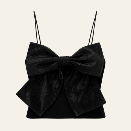 This women’s strappy top brings playful elegance to evening dressing with its sculptural oversized bow. The sleek silhouette contrasts with the dramatic bow for a refined yet statement-making look. Perfect for cocktail soirées, festive dinners, or styled with tailored trousers for a modern night-out ensemble.