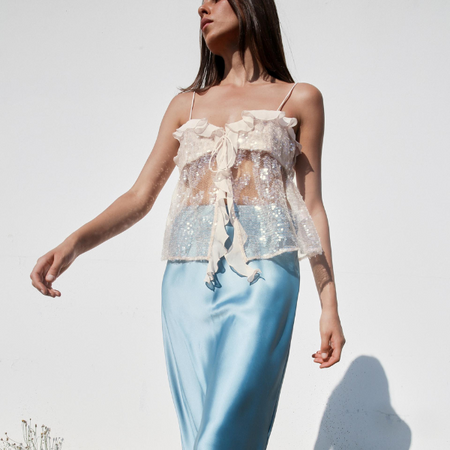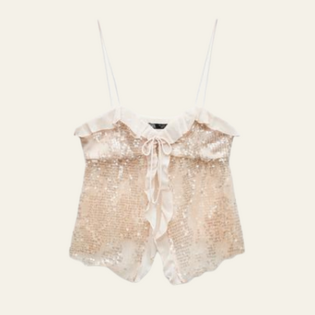 This women’s camisole top shimmers with delicate sequins and soft ruffle trims for an ethereal evening look. Its airy silhouette and tie-front detail create a feminine, romantic feel with subtle movement. Perfect for summer soirées, coastal dinners, or styled with tailored trousers for a refined resort ensemble.
