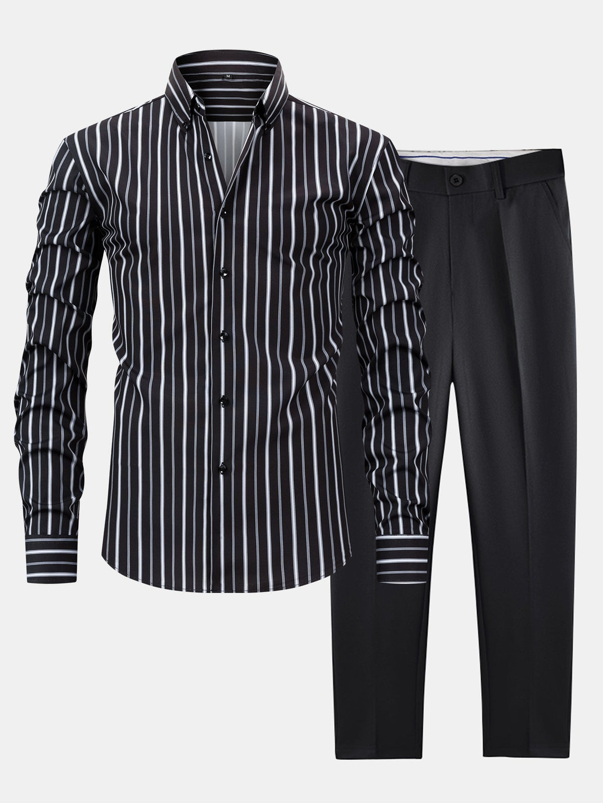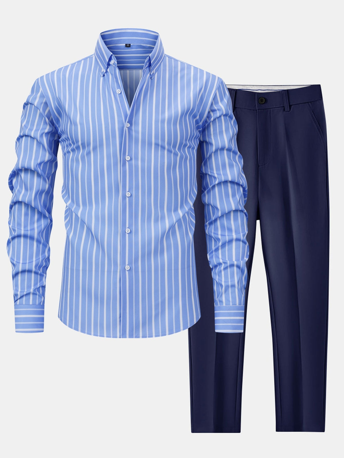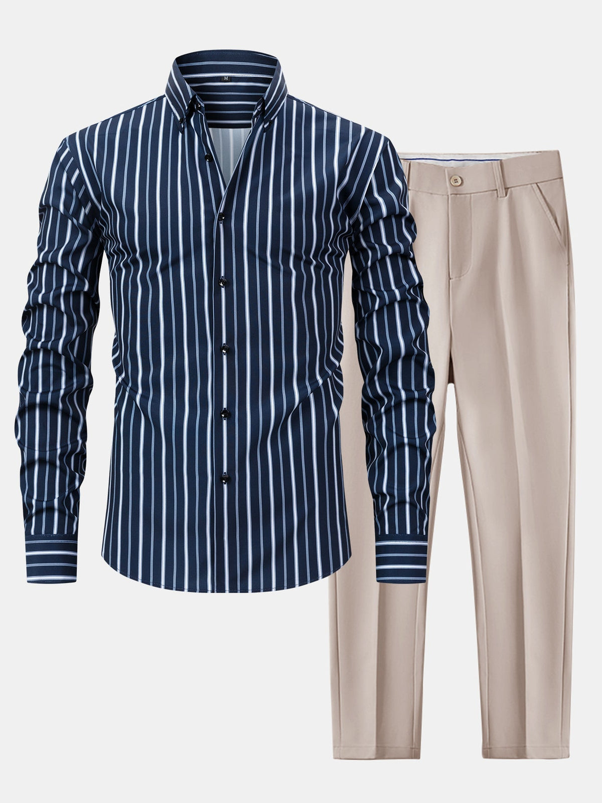 The long sleeve stripe button-up shirt features clean lines and a crisp collar, while the slim fit tapered trousers offer a sleek, structured silhouette—perfect for elevating your everyday style or stepping into a smart-casual setting with confidence.