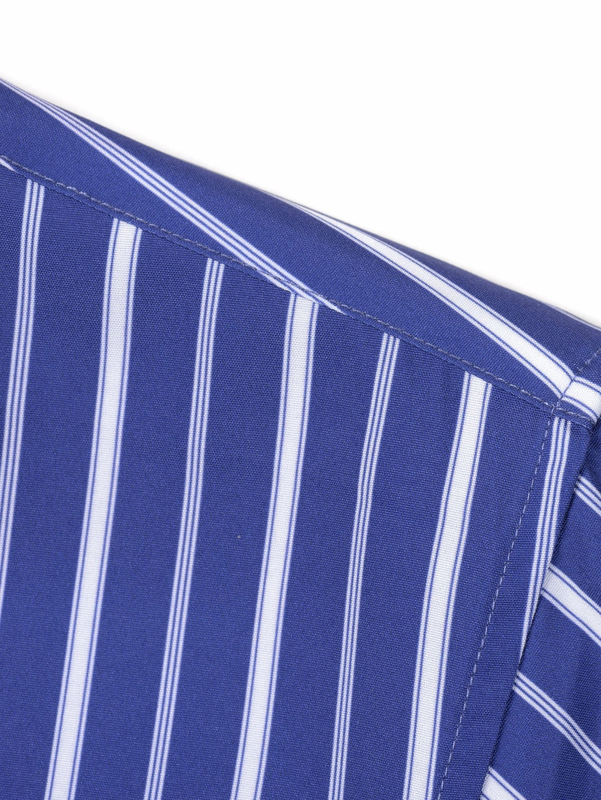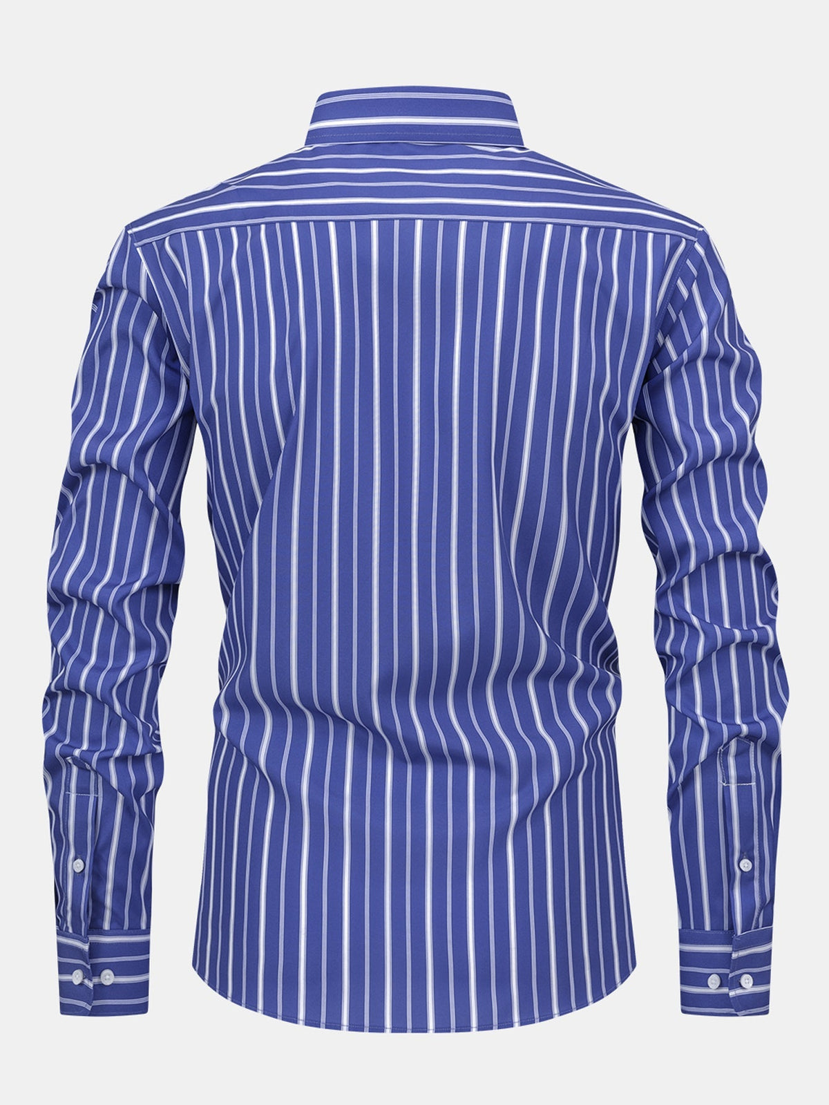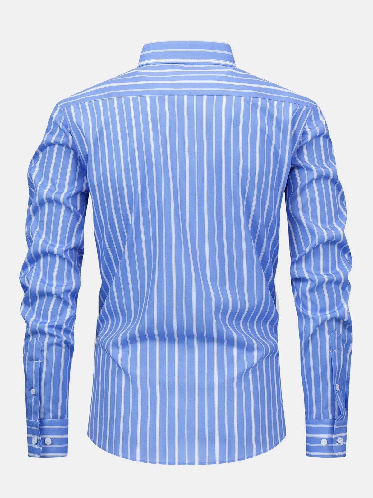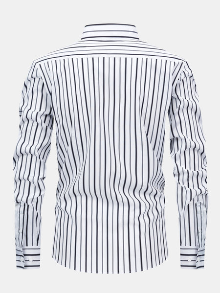 The long sleeve stripe button-up shirt features clean lines and a crisp collar, while the slim fit tapered trousers offer a sleek, structured silhouette—perfect for elevating your everyday style or stepping into a smart-casual setting with confidence.