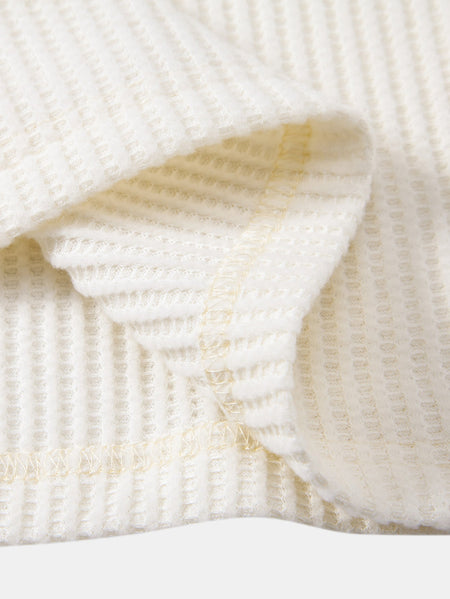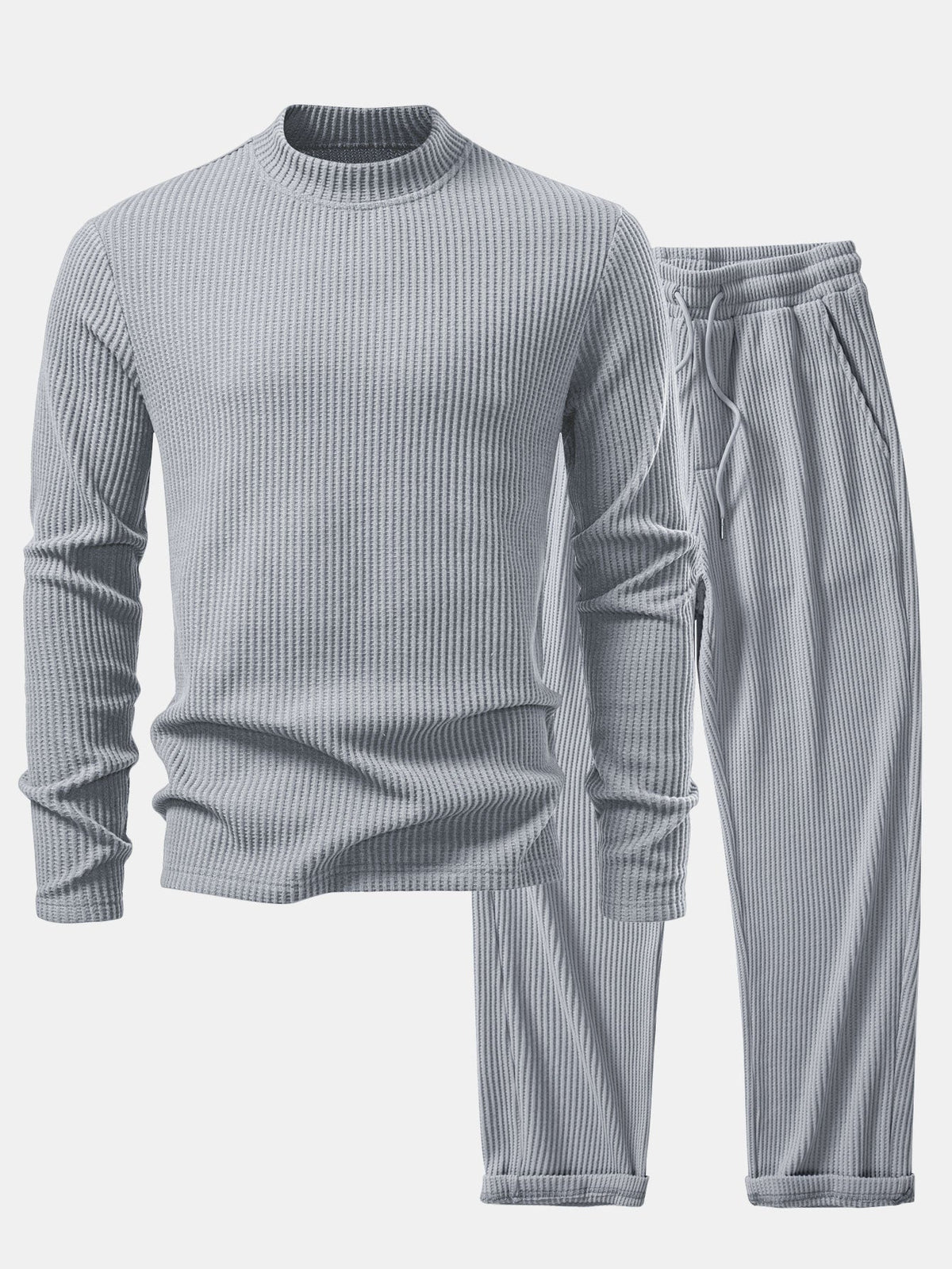 A cozy coordinated set: soft waffle-knit long-sleeve mock neck tee with a snug yet relaxed fit, paired with matching drawstring pants. Both share breathable, textured fabric. Pants feature adjustable waist and ribbed cuffs. Perfect together for lazy days or mixed with staples—comfort meets easy style.