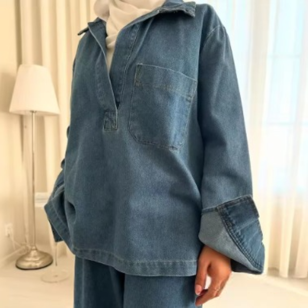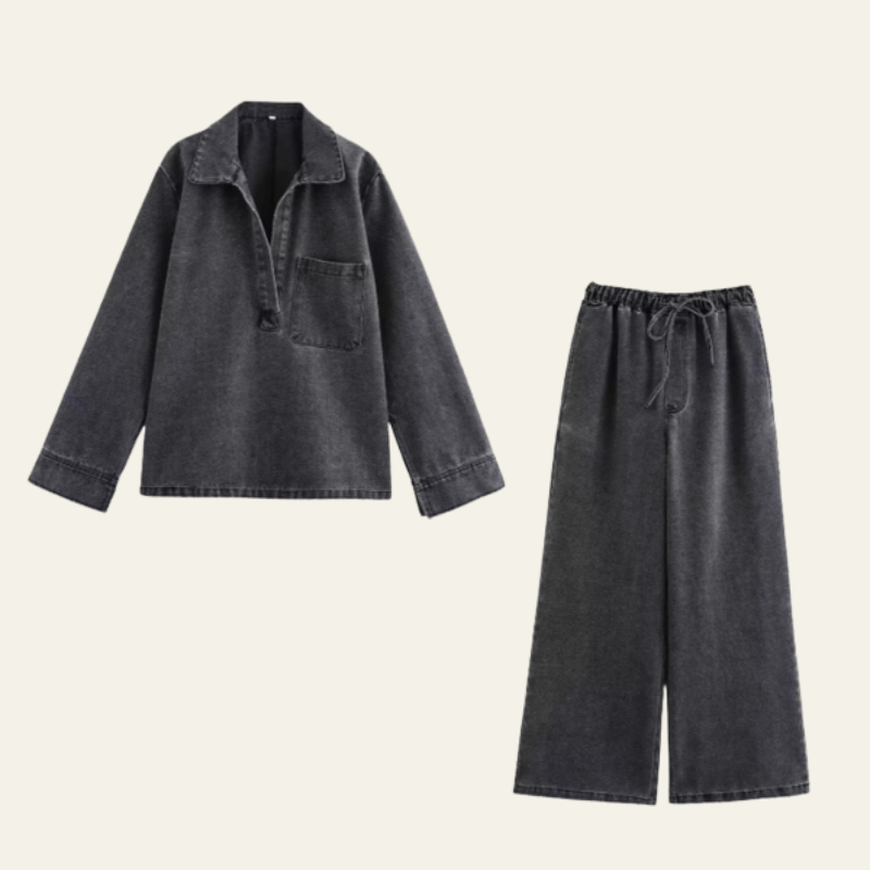 This women’s denim two-piece set blends relaxed tailoring with a refined, effortless silhouette. The soft denim drapes fluidly while the collared top and wide-leg trousers evoke understated sophistication. Perfect for coastal escapes or laid-back city days styled with leather sandals.