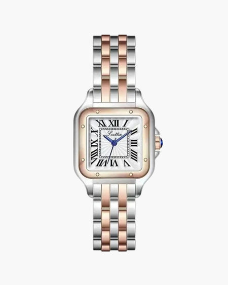 This two-tone stainless steel watch seamlessly combines modern sophistication with timeless design. Featuring a square dial, Roman numeral markers, and a rose gold-accented bracelet, it’s a versatile accessory for formal occasions or elevating everyday style.