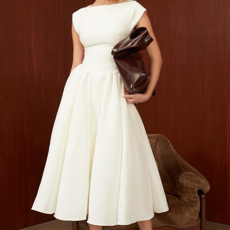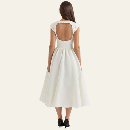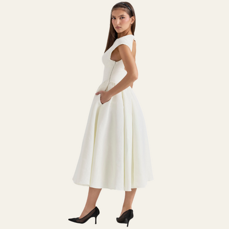 This women’s A-line midi dress embodies timeless European grace with its sculpted bodice and flowing skirt. Its clean lines and soft drape create a refined silhouette that moves elegantly with every step. Perfect for garden gatherings or city soirées styled with pearls and heeled sandals.