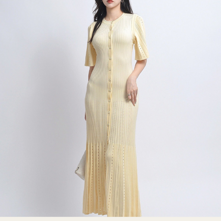 This women’s knit maxi dress embodies quiet luxury with its softly flared silhouette and button-down front.