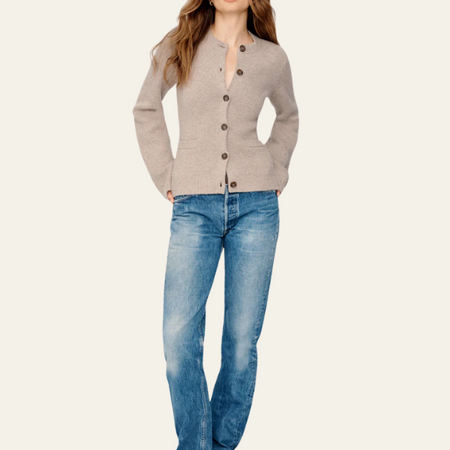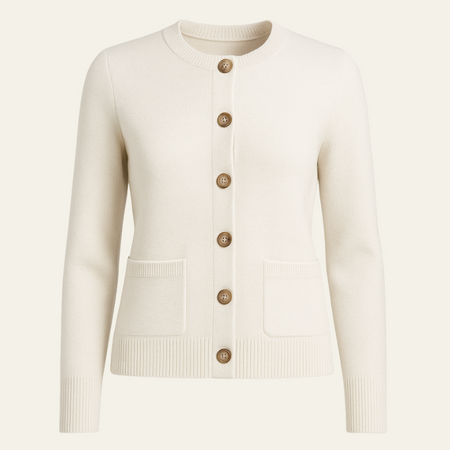 This women’s button-up cardigan embodies quiet luxury with its clean silhouette and softly structured shape.