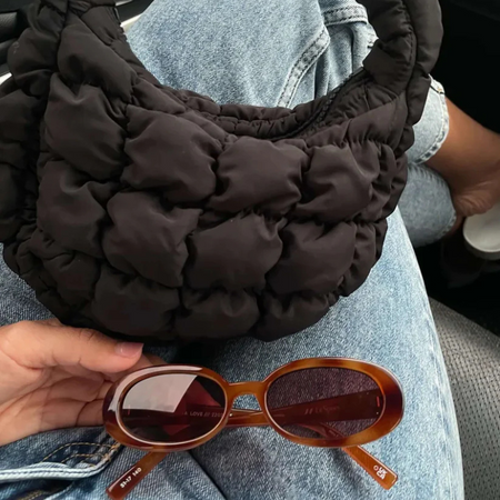 A women’s black shoulder bag designed in a contemporary puffer silhouette for versatile day-to-evening wear.