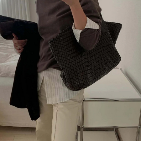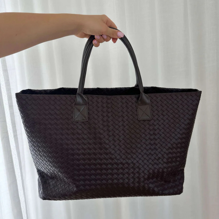 Women’s woven leather-effect tote bag designed for refined versatility and everyday sophistication. Spacious in structure and crafted with an artisanal weave, it embodies timeless elegance and durability. Perfect for city errands, workdays, or coastal escapes — a quiet luxury staple for modern lifestyles.