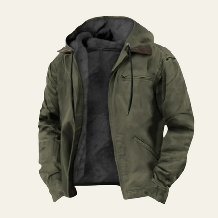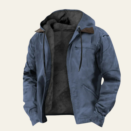 This men’s hooded winter jacket combines casual refinement with insulated comfort for colder days.