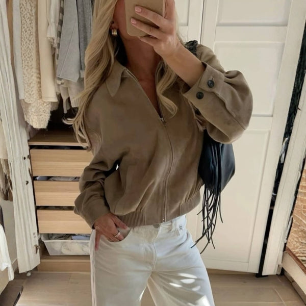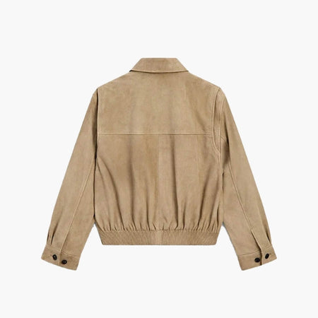 A womens suede bomber jacket in soft beige for refined casual elegance.