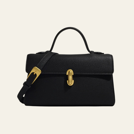 Women’s structured satchel bag in premium vegan leather with a refined top handle and detachable crossbody strap. Featuring a pebbled finish and polished gold-tone hardware, it combines elegance with everyday practicality. Its compact yet functional design transitions seamlessly from day to evening styling.