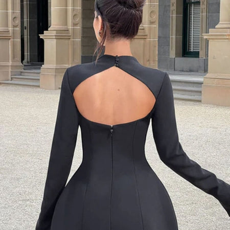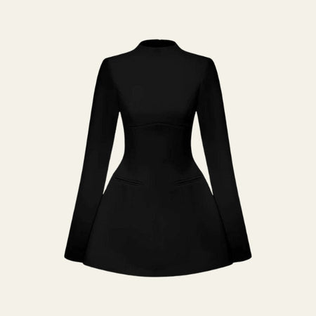 Tailored structure, flared sleeves, and open-back detail create modern elegance.