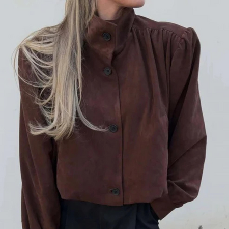 A tailored womens suede jacket with a high collar and subtle padded shoulders for vintage-inspired elegance. The structured silhouette and soft finish combine modern minimalism with classic refinement. Ideal for pairing with wide-leg trousers or skirts for both elevated daywear and chic evenings.