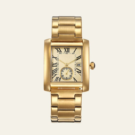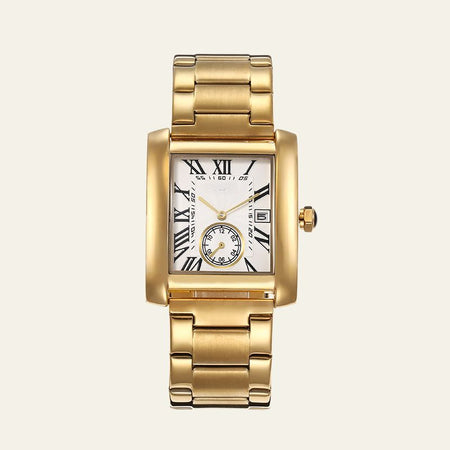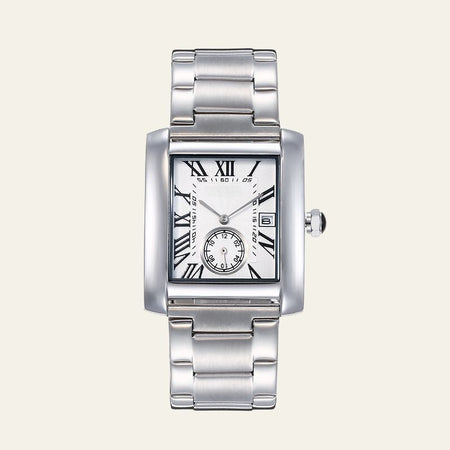 A men’s stainless steel rectangular watch designed for timeless European elegance and enduring refinement. Featuring Roman numeral detailing and a brushed bracelet, it blends polished sophistication with a streamlined modern profile. Perfect for heritage gatherings or paired with tailored chinos for evening aperitifs.
