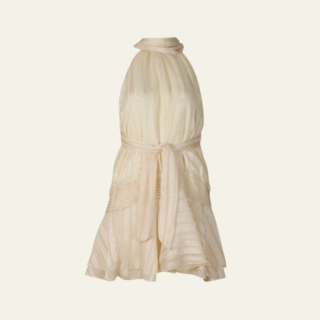 Womens halter-neck mini dress in apricot satin, designed for radiant evenings.
