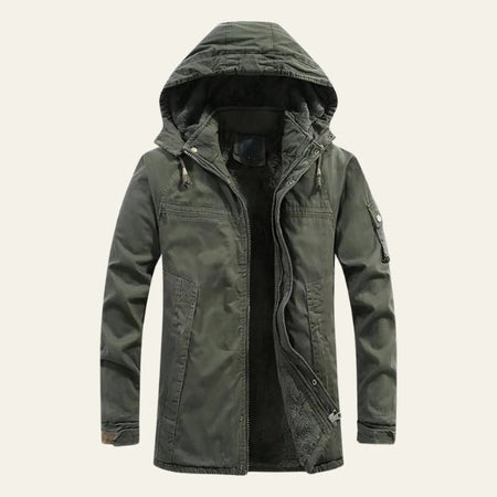 Mens hooded winter jacket designed for warmth, protection, and refined casual style.