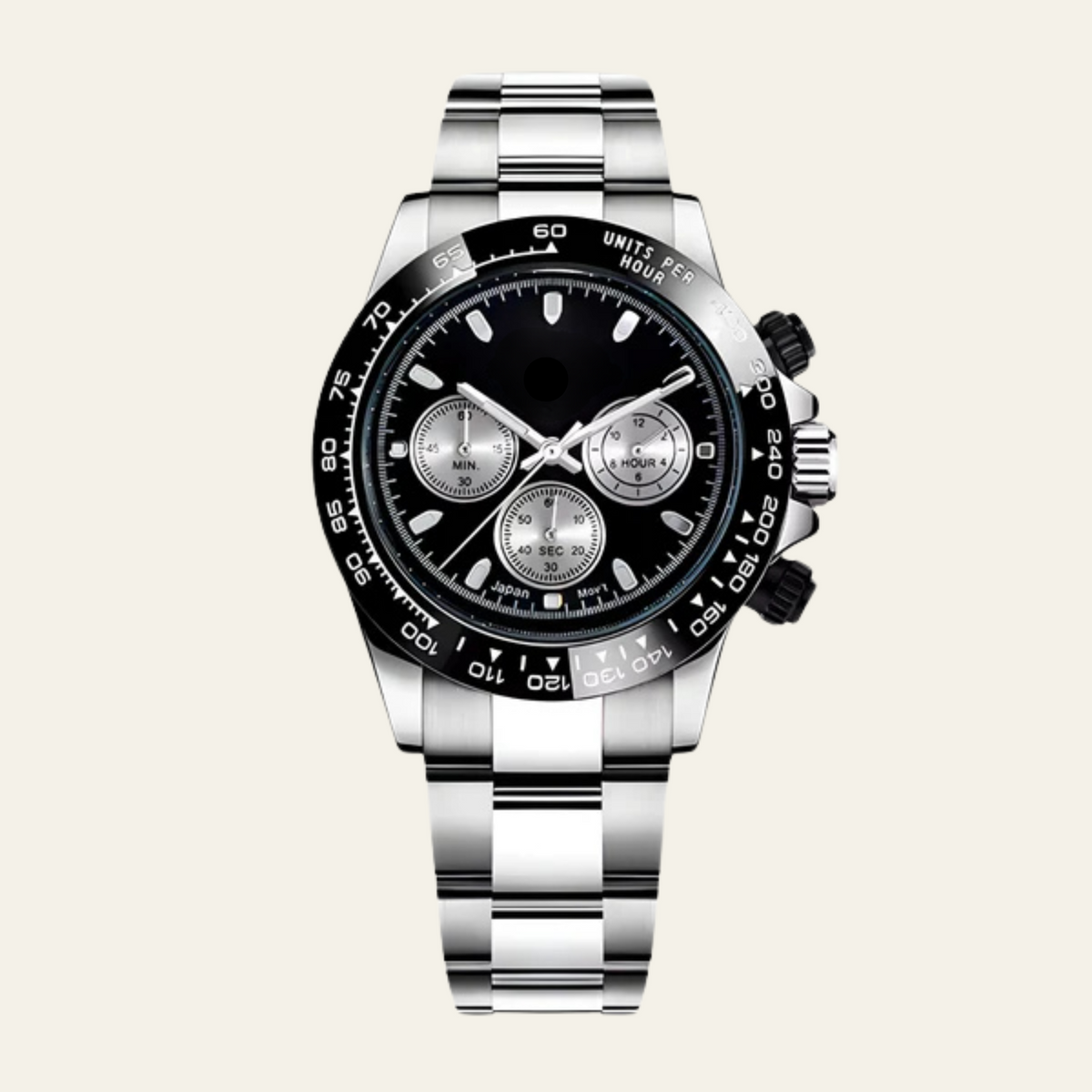 A refined men’s chronograph watch in stainless steel, crafted for timeless European elegance and modern versatility. Designed with a polished finish and smooth drape across the wrist, it embodies understated sophistication. Perfect for Riviera holidays or paired with a crisp white shirt for city evenings.