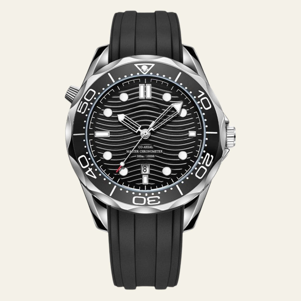 A refined men’s stainless steel diver watch designed for coastal elegance and enduring versatility. Featuring a sleek black dial with wave detailing, it balances timeless sophistication with modern precision. Ideal for Riviera holidays or paired with a crisp white shirt for city evenings.