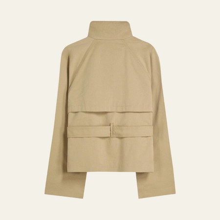A modern womens trench jacket with a cropped silhouette and belted waist.