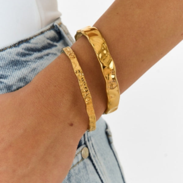 Womens cuff bracelet in hammered gold tones designed for modern elegance.