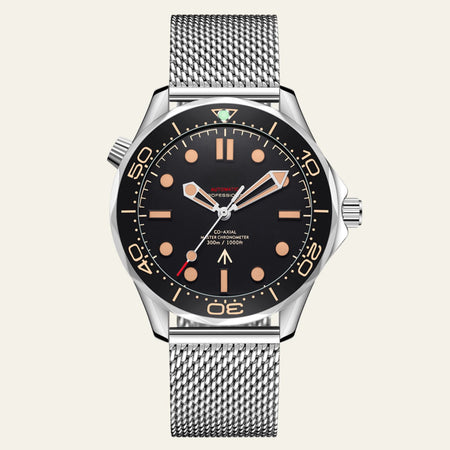 A refined men’s stainless steel diver watch crafted for Riviera holidays and modern European elegance. With its bold black dial, vintage-inspired indices, and precision chronometer movement, it offers both timeless sophistication and everyday versatility. Designed to move seamlessly from yacht weekends to city commutes.
