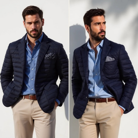 A men’s quilted blazer crafted for timeless European sophistication and year-round versatility. The lightweight padded design offers discreet warmth with a refined silhouette. Perfect for autumn weekends and city commutes, styled over a crisp shirt with tailored trousers or denim.