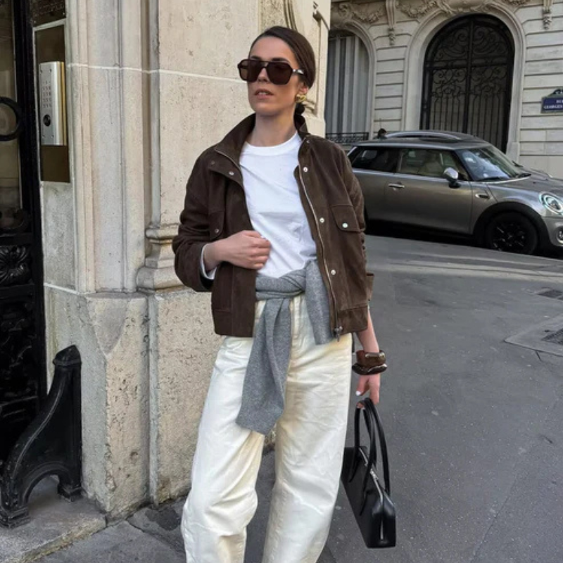 A contemporary womens bomber jacket in suede design, crafted for modern city layers.