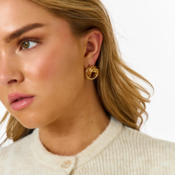 Womens gold earring styled in a timeless knot design for effortless sophistication.