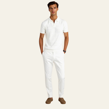 This men’s knit polo shirt with subtle texture embodies quiet luxury and refined ease.