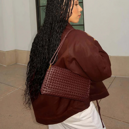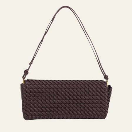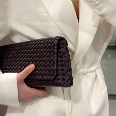 Women’s clutch bag crafted in a chic woven texture, blending elegance and modern versatility. Its deep burgundy shade makes it perfect for both daywear and evening occasions. With its slim yet spacious structure, it can be carried by hand as a clutch or worn on the shoulder with the detachable strap.
