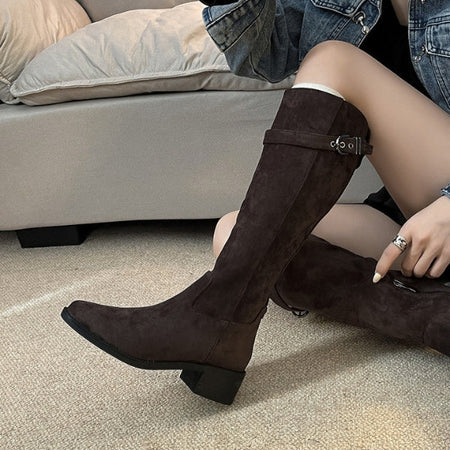 Womens suede knee-high boot with refined equestrian styling for timeless elegance.
