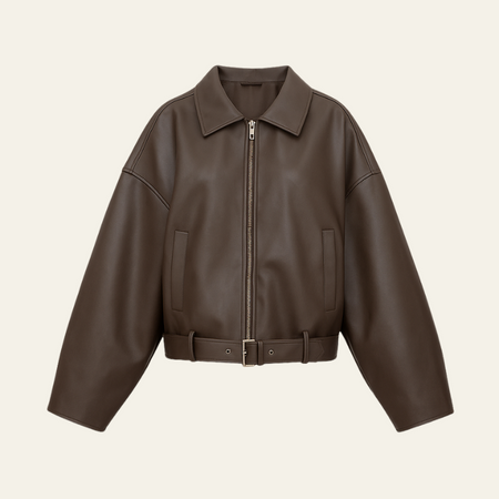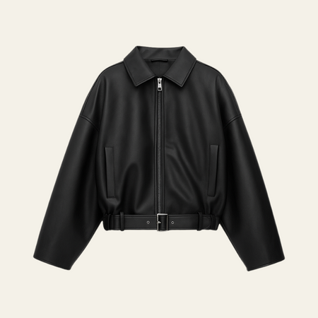 Womens vegan leather jacket crafted with a moto-inspired silhouette for modern elegance. Soft yet structured, featuring a belted hem, zipper closure, and lapel collar for timeless appeal. Perfect for city layering, evening style, or transitional travel wear.