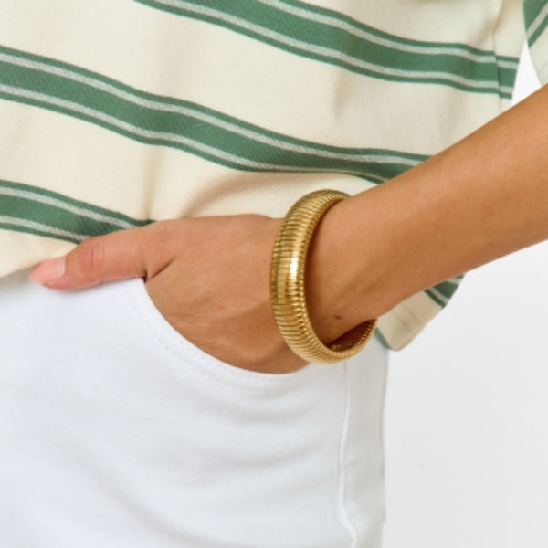 Womens bangle bracelet in radiant gold tones for effortless sophistication.