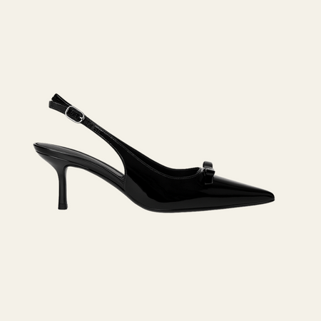 Womens slingback heel with a pointed toe and sleek satin finish for modern elegance.