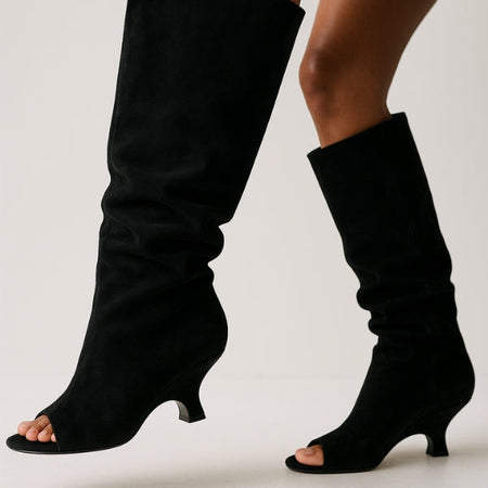 Womens knee-high suede peep-toe boot designed for modern elegance and effortless sophistication. Crafted with soft suede for a supple texture, breathable comfort, and a flattering drape. Perfect for elevated evenings, chic city strolls, or resort-ready styling.