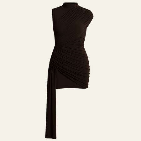 Womens draped asymmetric mini dress designed for bold evening statements.