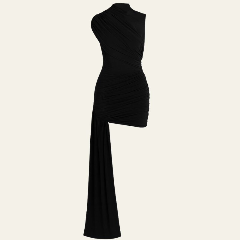 Luxurious ruching and sculpted tailoring create a sleek, form-enhancing silhouette.