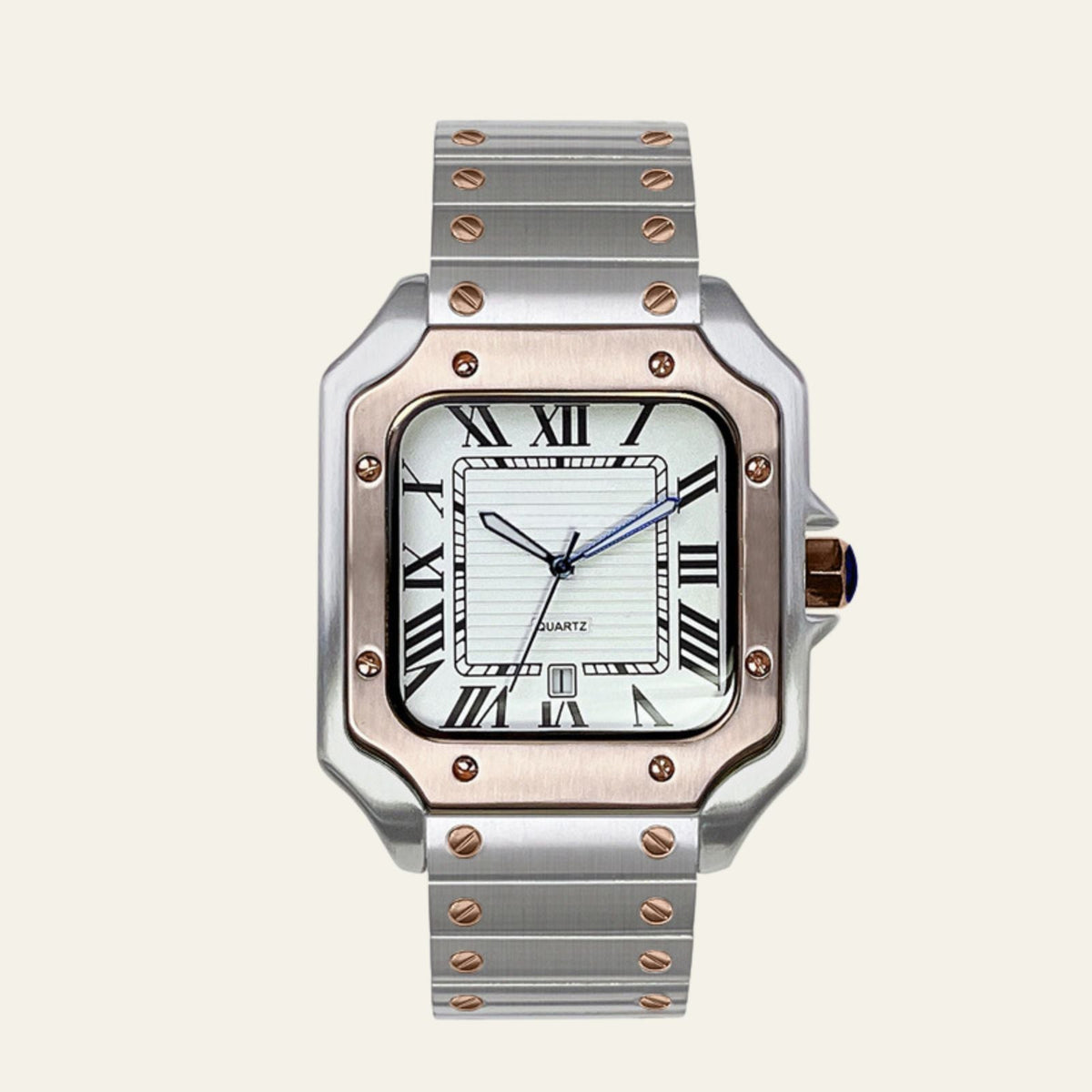 Signature square dial with Roman numerals and framed inner track