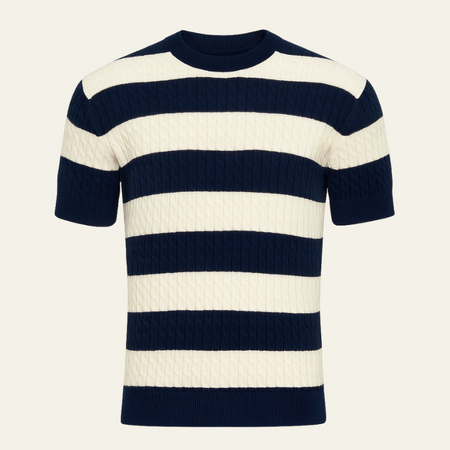 A men’s cotton stripe knit designed for timeless Riviera elegance and effortless versatility. Crafted with a lightly ribbed texture, it delivers breathable comfort with an elevated finish. Perfect for seaside strolls at sunset or paired with tailored trousers for coastal dinners.
