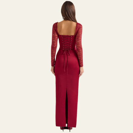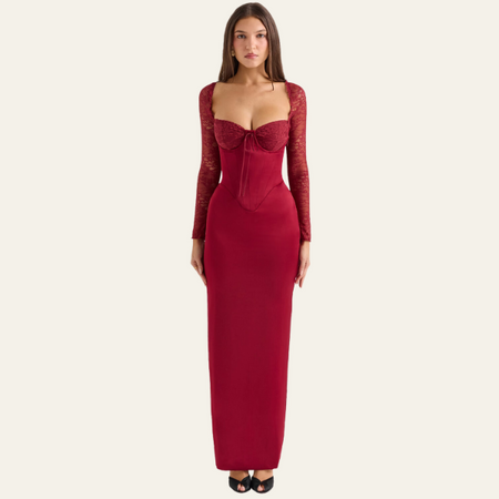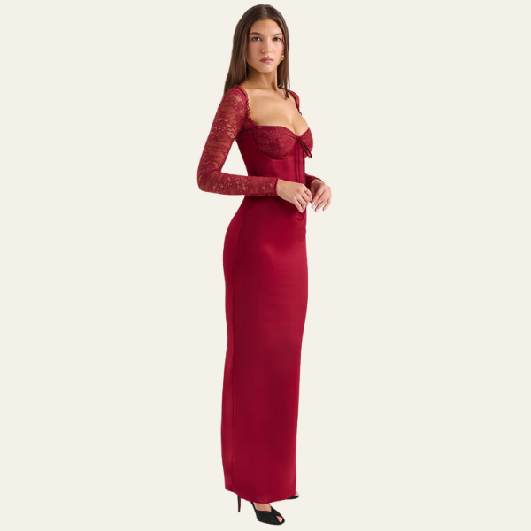 This women’s maxi dress captivates with its corset-inspired bodice, lace sleeves, and sculpted hourglass silhouette.